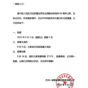 据报道,9月1日,兰州一城管家家政服务有限公司发布通知,所有员工9月3日休假一天,在家观看九三阅兵。相关消息发布后,网友们纷纷点赞。