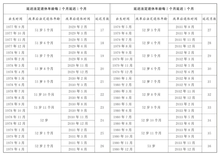 女职工延迟法定退休年龄对照表
