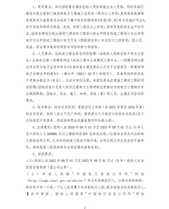 投标人资格要求:投标人自 2020年09月01日至2025年09月01日止(5年),至少具有1个500MWh及以上储能项目EPC总承包业绩。