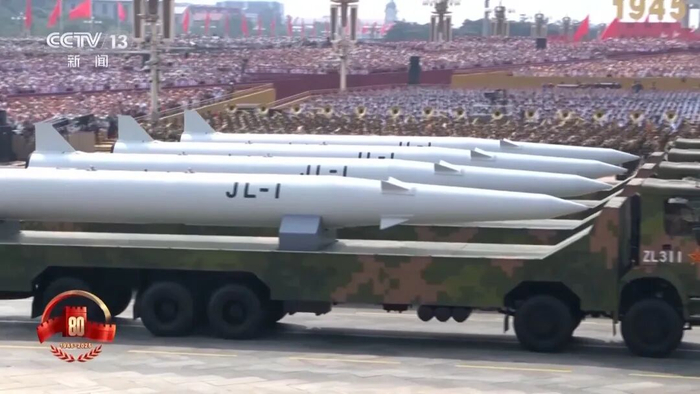 核导弹第一方队由多个军种混编组成,集中展示我军“三位一体”战略核力量,是守护国家安全的坚实后盾,受阅装备依次为 “惊雷-1”空基远程导弹、“巨浪-3”潜射洲际导弹、“东风-61”陆基洲际导弹和“东风-31”新型陆基洲际导弹。