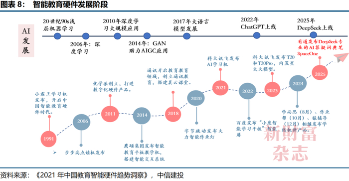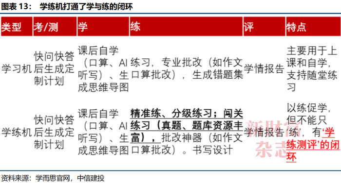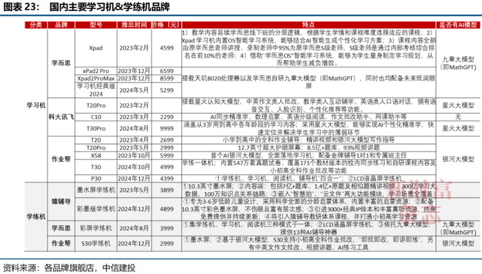 “AI+教育”硬件方面,学习机或学练机产品保持较快增长势头。这些硬件内嵌丰富的课程资源,能帮助学生搭建知识框架,建立自适应学习机制,助力计划性、个性化学习。一是学习内容,教育硬件内嵌全科校内课程以及优质名师培优课程,能通过分析新课标、新考纲等要求,重新组织知识点并实现100%匹配讲解视频。在精准学的场景下,每个视频时长5—10分钟,在学生有限的注意力集中时段提供更高效的学习方式。二是学习方式,通过学习机的“诊断规划”功能,识别学生知识薄弱点,管理学生的认知负荷,通过给学生提供个性化的学情反馈,制定学习路径和学习计划,推送适合当前水平的学习内容。