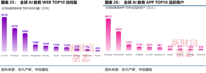 海外AI教育产品在WEB端(网页端)展现出了显著的竞争优势,国内部分企业AI教育软件出海也取得了较好的进展。根据非凡产研数据,2024年,Quizlet(一家专注于在线学习工具和数字闪卡的美国教育科技公司)旗下的AI个人辅导工具Q—chat,通过互动对话帮助学生更好地理解和掌握学习内容,月访问量高达9518万次,占据AI教育WEB榜的第一;语言学习产品多邻国网页端月访问量也高达6476万次,排名第二。出海方面,作业帮旗下的Question AI和字节跳动旗下的Gauth移动端位列第六和第七,显示出其在出海教育领域的强大竞争力。