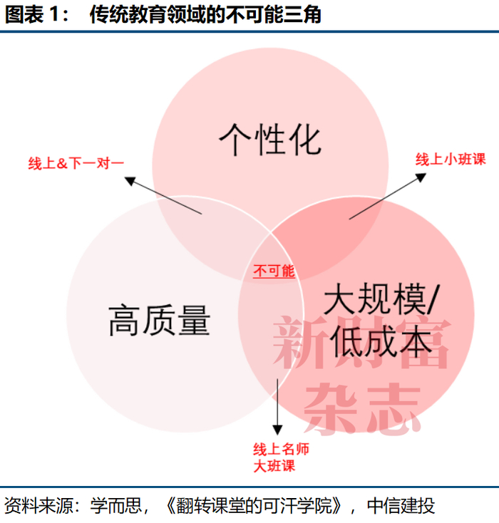 1984年,美国教育家本杰明·布鲁姆(Benjamin Bloom)通过实验提出“two sigma”理论,即接受个性化辅导的学生成绩比传统课堂学生高出两个标准差。然而,传统教育却面临“不可能三角”的挑战,即无法同时做到个性化、高质量、大规模及低成本。每一轮技术进步中,教育都是靠后被改造的应用场景,“替代主讲老师”这一命题仍较难实现。