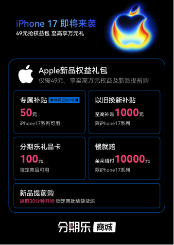 8月26日,苹果官宣 “Awe dropping”(中文“前方超燃”)秋季发布会将于9月10日举办。据了解,苹果新品发布会当天,分期乐商城将开启新品购买预约。官方预售开始后,用户可在分期乐商城与全球“果粉”同步预购。届时,购买49元权益包的用户即可享有最高万元专属权益。用户可领取50元iPhone17系列产品专用券,叠加以旧换新至高1000元的加价补贴,大幅降低购机成本;同时,用户将获得100元分期乐礼品卡,用于指定商品消费,进一步拓展消费优惠场景。此外,权益包还提供“新品提前购”资格,可较其他用户提前30分钟开抢,优先锁定首批稀缺货源。针对发货时效问题,权益包还包括“发货慢就赔”服务。用户成功支付购买支持该服务iPhone17系列,享受自约定发货时起48小时内发货。如订单超过约定时间未发货,用户选择继续等待,将获得赔偿,其中延迟发货超过30天,可获赔付10000元。