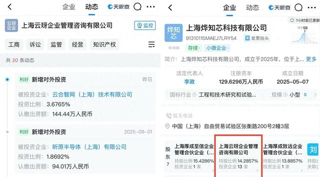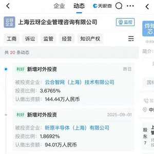 8月29日,上海云玡企业管理咨询有限公司又投资了上海烨知芯科技有限公司,持股比例为14.29%。公开资料显示,该公司致力于端侧AI芯片研发,以完全自主研发的高能效比NPU为核心,为智能眼镜、手机、机器人等提供AI芯片及软硬件协同解决方案。