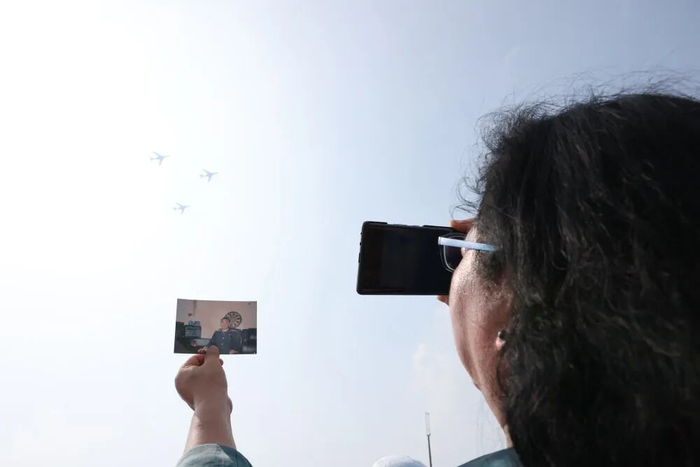 9月3日,空中梯队飞过天安门广场时,王伟的妻子阮国琴在观礼台上把王伟的照片举向蓝天。