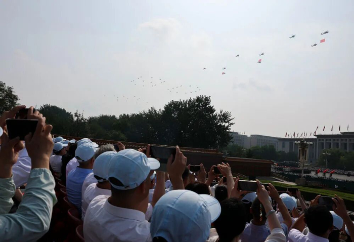 9月3日,观礼嘉宾拍摄空中护旗梯队飞过天安门广场上空。
