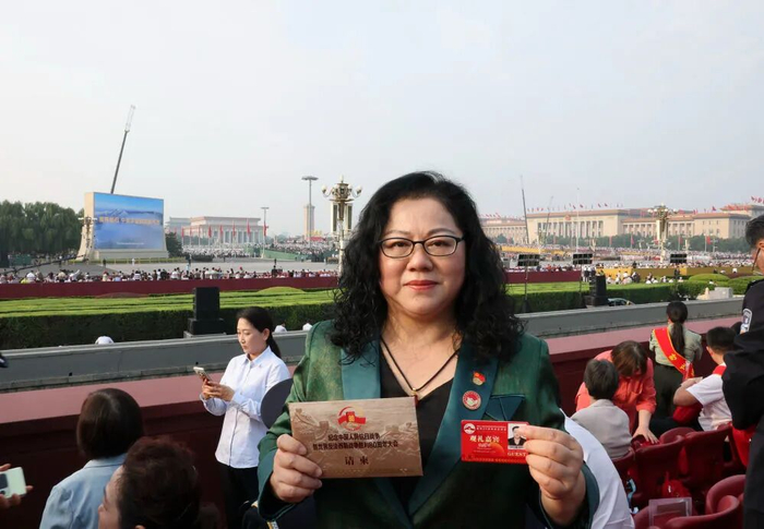 9月3日,王伟的妻子阮国琴(二排右二)在观礼台上。