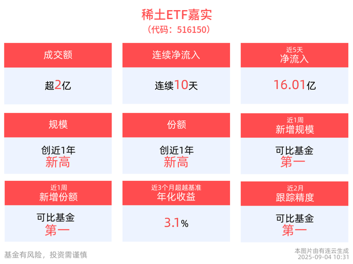 全球稀土产业链进入传统消费旺季,稀土ETF嘉实(516150)连续10日“吸金”超31亿元