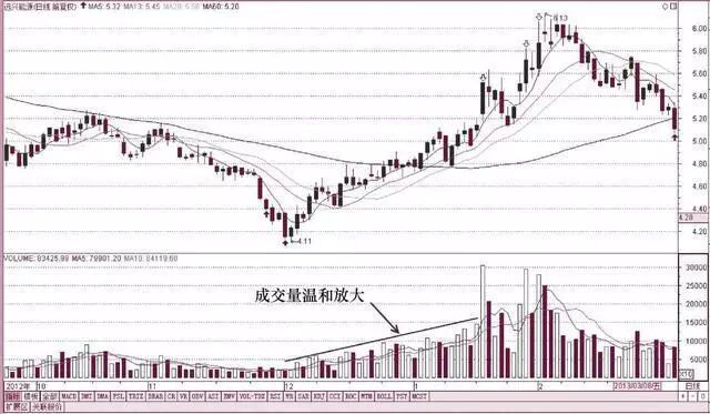温和放量是指个股的成交量在前期持续低迷之后,突然出现一个类似“山形”的连续温和放量形态。个股出现这种情况一般表明有实力资金在介入,个股在底部出现温和放量之后,股价会随量上升,量缩时股价会适当调整。调整持续一段时间后,股价的上涨会逐步加快。投资者需要注意的是,当股价温和放量上扬之后,其调整幅度不宜低于放量前期的低点,因为调整如果低过了主力建仓的成本区,说明市场的抛压还是很大,后市调整的可能性就较大。成交量温和放大的直观特征就是量柱顶点的连线呈现平滑的抛物线形上升,线路无剧烈的拐点。换手率应该在3%~5%。温和放大的原因是随着吸筹的延续,外部筹码日益稀少,从而使股票价格逐步上升,但因为是主力有意识地吸筹,所以在其刻意调控之下,股价和成交量都被限制在一个温和变化的水平,以防止引起市场的关注。