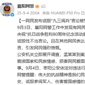 新京报讯 据襄阳网警官博消息,9月3日,襄阳网警工作中发现有网民孟某某(男,47岁)在微信朋友圈网友转发央视“抗日战争胜利80周年纪念活动直播”的评论中针对九三阅兵活动发表诬蔑、诋毁性不当言论。且在其他网民表达爱国言论时,孟某某进行侮辱嘲讽并散布谣言,引发网民强烈愤慨。
