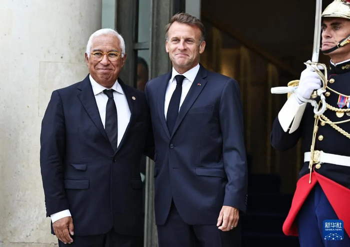 9月4日,在法国首都巴黎的总统府爱丽舍宫,法国总统马克龙(右)迎接出席“志愿联盟”线上会议的乌克兰总统泽连斯基。新华社记者高静 摄