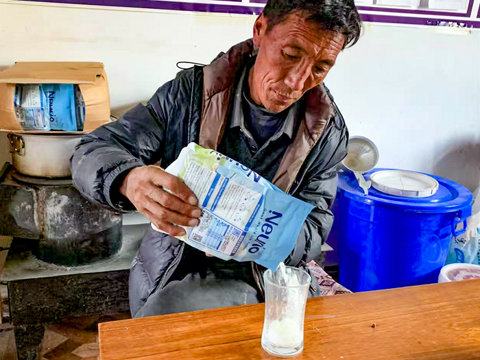 西藏日喀则市定日县驻村工作队在“百日走村入户大调研”和灾后恢复重建工作中,曾经提到希望重点关注“一老一小”、孕产妇等特殊群体的营养健康需求,并呼吁社会持续关注,为农牧民群众健康切实“加餐”。这一诉求被悦尔公益及纽瑞优(Neurio)深深铭记,并将其化作一场温暖的行动。8月15日,市场价值百万元的3000份乳制营养品跨越山河,送至定日县180个行政村的老人与儿童手中。