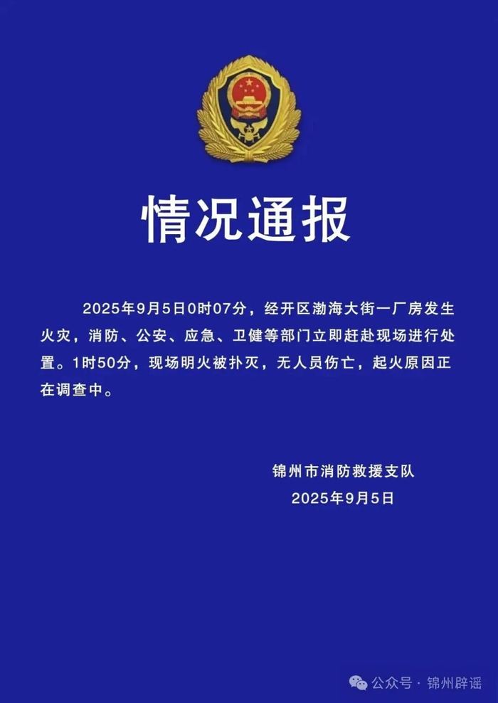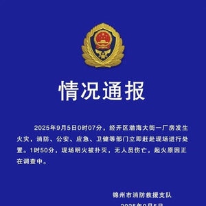辽宁锦州通报“一厂房凌晨发生火灾”:明火被扑灭,无人员伤亡