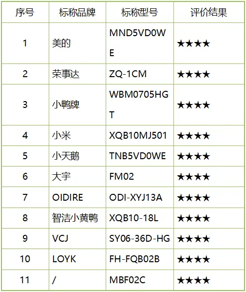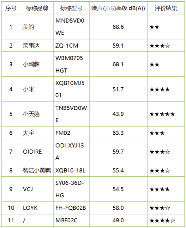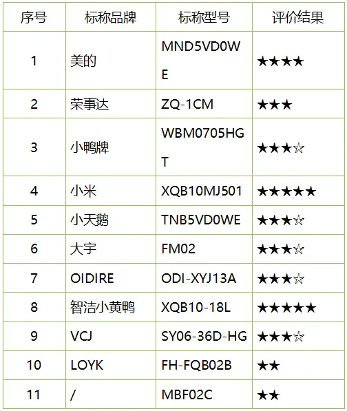 综合消委会此次比较试验结果,智洁小黄鸭获评5星,小 米获评4.5星,美 的、VCJ均获评4星,OIDIRE获评3.5星。