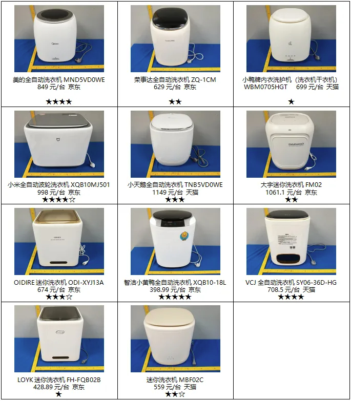 该次比较试验的11款内衣裤洗衣机均由消委会工作人员以普通消费者的身份从京东商城和天猫商城购买,单价从398.99元到1149元不等。品牌涉及美的、荣事达、小鸭牌、小米、小天鹅、大宇、OIDIRE、智洁小黄鸭、VCJ、LOYK。