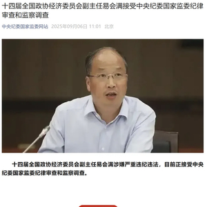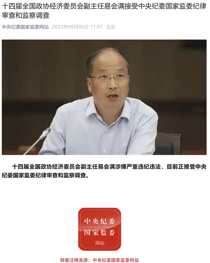据中央纪委国家监委消息,十四届全国政协经济委员会副主任易会满涉嫌严重违纪违法,目前正接受中央纪委国家监委纪律审查和监察调查。