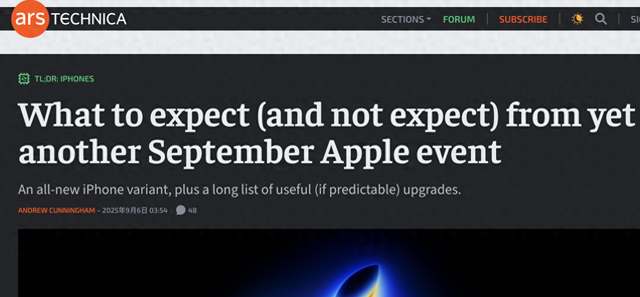 【环球网科技综合报道】9月6日消息,据arstechnica报道,苹果将于9月9日举办秋季新品发布会。综合多家权威渠道与零部件供应链信息,新一代 iPhone、Apple Watch 及智能家居配件的升级细节已浮出水面:外观微调、屏幕高刷下放、影像传感器全面 4800 万像素化,以及一款替代 Plus 定位的“iPhone Air”成为最大看点。