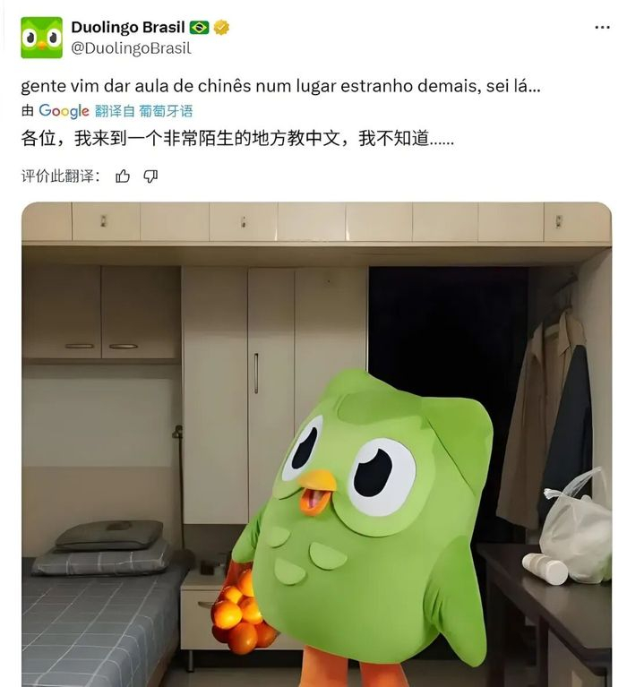 外语学习平台“多邻国”巴西版在Twitter/X发布一则贴文,内容是其吉祥物“多儿”提着一袋水果走进“红姐的房间”,文中写道:“各位,我来一个超奇怪的地方教中文了,说不上来是怎么回事。”看到的网友也很懂得捧哏:“虽然是去教书,但看起来是去做别的事了呢”。