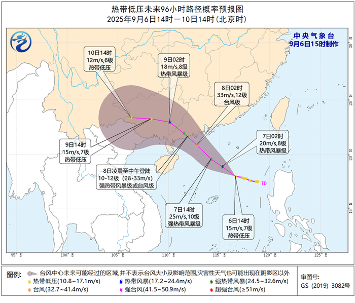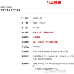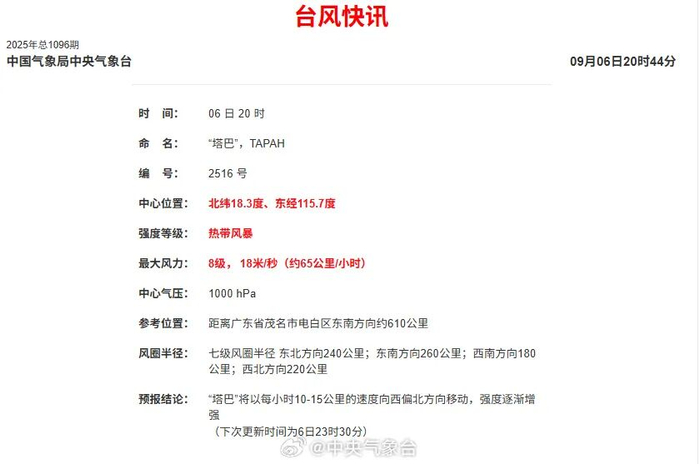 中央气象台9月6日21时07分发布消息:今年第16号台风“塔巴”(TAPAH)于6日20时生成,其中心20时位于距离广东省茂名市电白区东南方向约610公里的洋面上(北纬18.3度、东经115.7度),中心附近最大风力8级(18米/秒)。