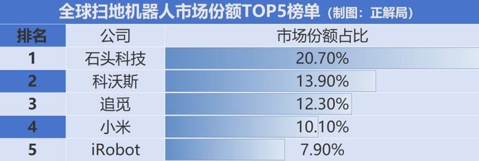 全球扫地机器人市场份额TOP5榜单中,中国品牌占据四席,石头科技以20.7%的市场份额位列第一,科沃斯(13.9%)、追觅(12.3%)、小米(10.1%)位列第二至四名,仅iRobot(7.9%)为非中国品牌。