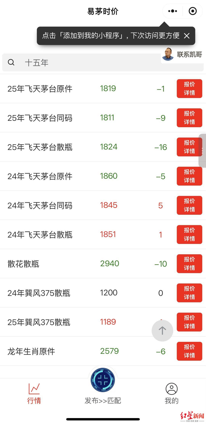 红星资本局查询“易茅时价”小程序发现,同款飞天茅台标价1824元/瓶,跌了16元/瓶。