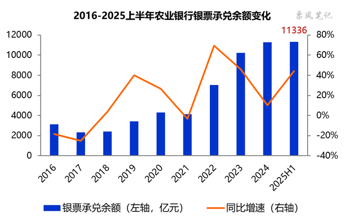 2025年6月末,年报显示农业银行银票承兑余额为11336亿元,同比增长44.10%,较上年末增长0.56%,银票承兑余额继续排名市场第一。2025年6月末,农业银行银票承兑余额/总资产的比例为2.42%,较上年末下降0.19个百分点,依然远低于监管比例上限15%。一般来说,农业银行银票承兑余额上半年增长较为缓慢,甚至下降,下半年增长较快。