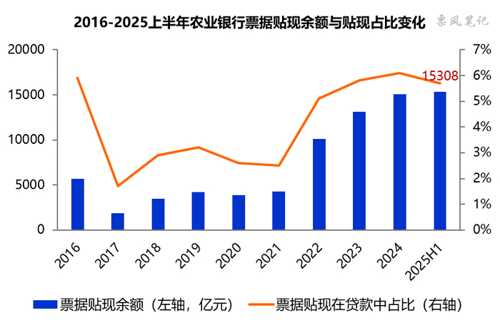 2025年6月末,农业银行票据贴现余额为15308亿元,同比增长63.73%,较上年末增长1.52%,说明今年上半年农业银行并未如去年上半年那样缩减持票规模,票据贴现余额排名市场第三位;票据贴现在贷款中占比为5.7%,较上年末下降0.4个百分点。2022年以后农业银行票据贴现余额快速增长。