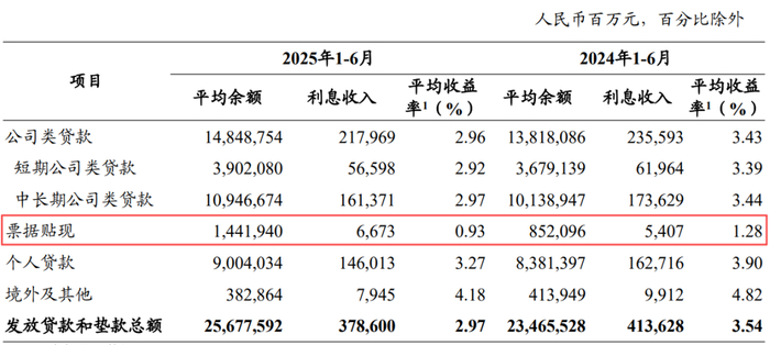 2025年上半年,农业银行票据贴现平均余额是1.44万亿元,利息收入66.73亿元,平均收益率为0.93%,较去年同期下降0.35个百分点,同期公司类贷款平均收益率降幅是0.47个百分点。2025年上半年国有四大行票据贴现平均收益率基本相当,平均值为0.94%。