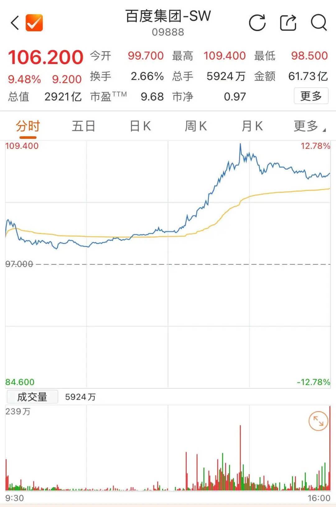 百度美股开盘大涨,盘中一度涨超9%,截至发稿,涨幅有所回落,涨6.75%。值得注意的是,截至今日港股收盘,百度集团-SW上涨9.48%至106.2港元,股价创今年以来新高。