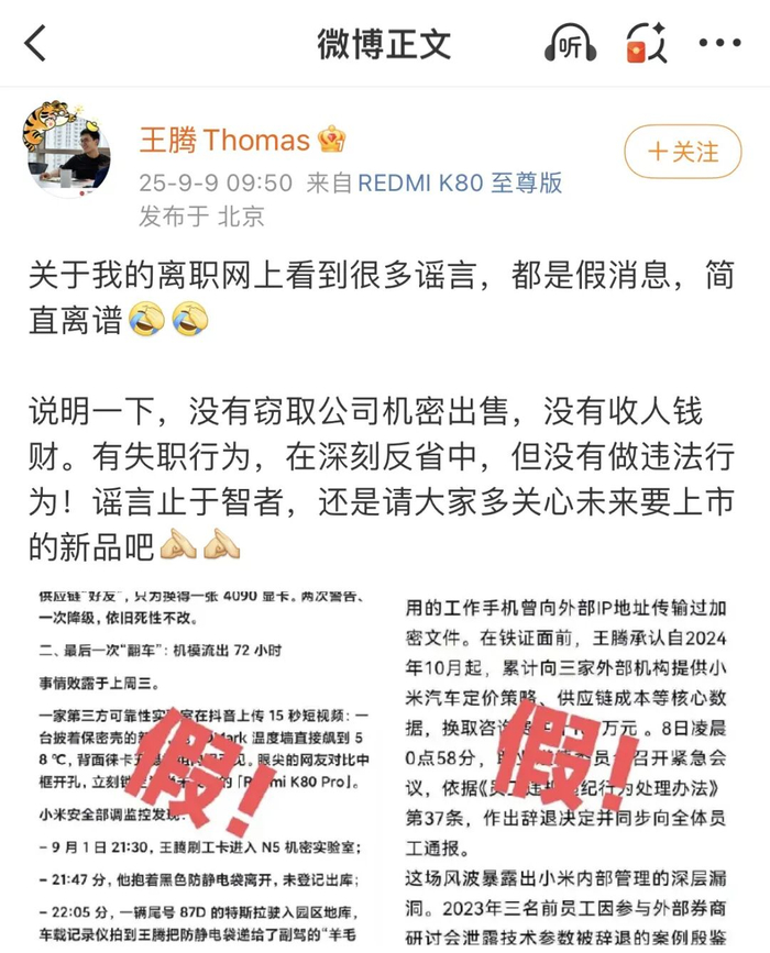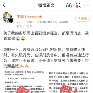 9月9日,@王腾Thomas 再发文,辟谣网传谣言:“关于我的离职网上看到很多谣言,都是假消息,简直离谱。说明一下,没有窃取公司机密出售,没有收人钱财。有失职行为,在深刻反省中,但没有做违法行为!谣言止于智者,还是请大家多关心未来要上市的新品吧。”