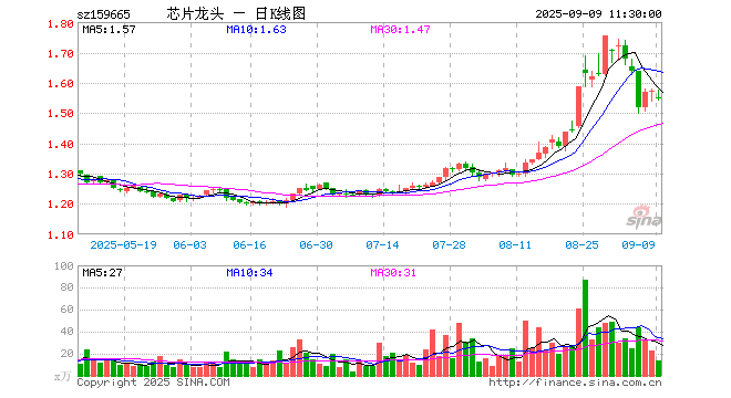 9月9日,截止午间收盘,半导体龙头ETF(159665)跌1.59%,报1.547元,成交额2102.12万元。半导体龙头ETF(159665)重仓股方面,中芯国际截止午盘跌8.82%,海光信息跌2.13%,寒武纪涨1.34%,北方华创跌2.67%,豪威集团跌1.95%,澜起科技跌0.88%,中微公司跌2.70%,兆易创新跌3.07%,长电科技跌1.81%,紫光国微跌1.54%。