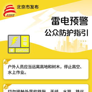 今天14时40分,北京市发布雷电黄色预警:预计今天傍晚至夜间,我市将自西向东出现雷阵雨天气,局地短时雨强较大,并伴有7、8级短时大风和小冰雹,请注意防范。
