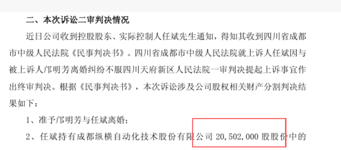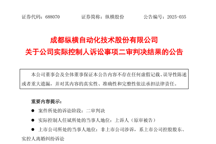 2025年7月,纵横股份(688070)发布公告,公司实控人任斌的离婚诉讼迎来二审判决。