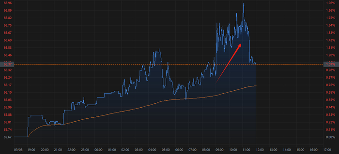 受该消息影响,国际油价明显冲高,布伦特原油期货价格从每桶66美元附近一度升破67美元,日内涨幅一度达到1.9%;