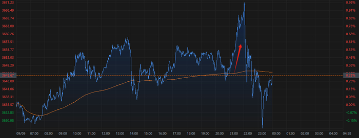 现货黄金也跳涨约30美元,将历史纪录刷新至每盎司3674美元,现回落至3645美元附近。