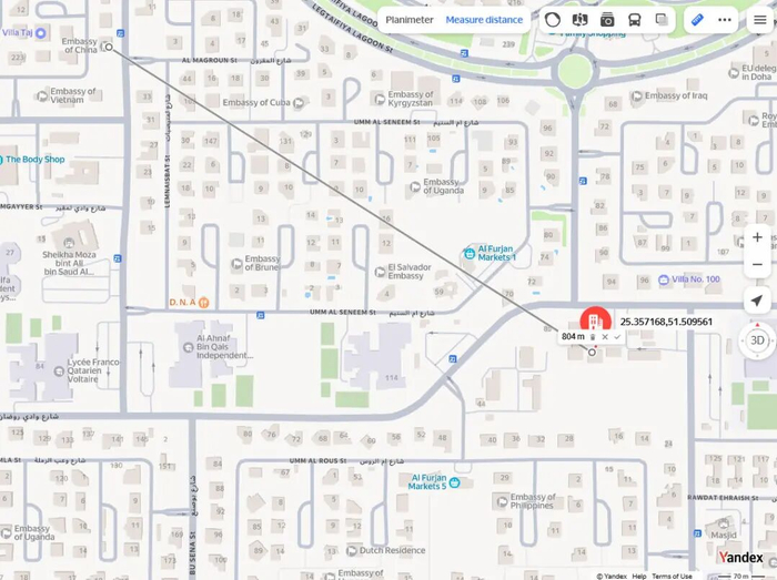 外媒发布的卫星图片显示,严重受损的哈马斯建筑物紧挨着瓦迪拉丹街,周围1公里范围内密集分布着十多个国家的大使馆和数所国际学校,比如中国使馆距空袭地点直线距离仅800米。
