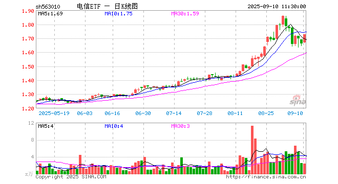 9月10日,截止午间收盘,电信ETF(563010)涨3.79%,报1.725元,成交额392.54万元。电信ETF(563010)重仓股方面,中国联通截止午盘涨7.31%,中国移动涨1.45%,中国电信涨1.81%,银之杰涨3.74%,中国卫通涨1.18%,中际旭创涨7.77%,新易盛涨7.31%,中兴通讯涨1.87%,紫光股份涨1.67%,中天科技涨1.32%。
