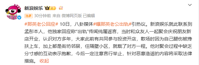 @新浪娱乐 就此联系到孟彤本人,他回应称“出轨”传闻纯属谣言,当时和众友人一起聚会庆祝朋友新店开业,认识对方多年,大家此前有共同参与投资开店,散场时因为自己腿伤被搀扶上车,加上都是街坊邻居,住隔壁小区,就载了对方一程。他对聚会过程中缺乏分寸感的互动表示抱歉,今后一定注意言行举止,针对恶意造谣的内容将采取法律措施。