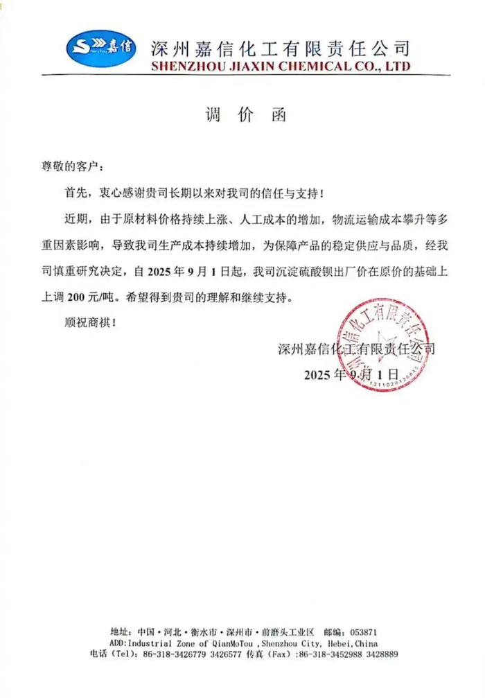 近期,硫酸钡行业涨价风波再起。集美精化宣布,所有沉淀硫酸钡产品价格上调200元/吨(折合30美元/吨),与此同时,贵州誉福隆科技、深州嘉信化工也同步宣布沉淀硫酸钡产品涨价200元/吨。