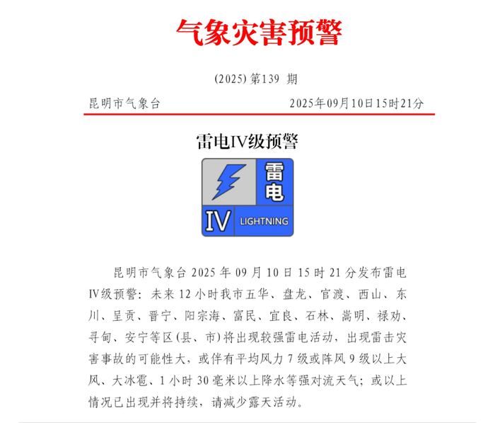 昆明发布雷电IV级预警