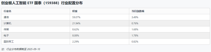 该 ETF 跟踪的是创业板人工智能指数(代码:970070)。根据 ETF 最新的申赎成分清单,投资行业主要集中在通信和计算机,权重分别为 59.07%和 21.94%,当日这两个行业指数涨幅分别为 3.49%和 0.76%,其中通信行业对 ETF 整体表现贡献显著。