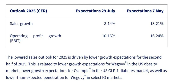 诺和诺德在财报中提及对2025年全年业绩展望,目前其预计今年销售同比增速在8%-14%之间,经营利润同比增速在10%-16%之间。这两项财务数据预期增速低于此前预期,且低于2024年二者26%的同比增速。