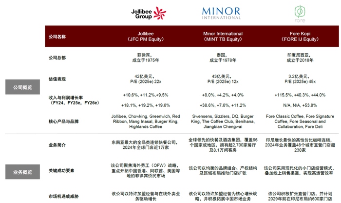 20世纪90年代至21世纪初,东南亚六国经济体为麦当劳、肯德基、赛百味、必胜客、达美乐和汉堡王等以西式餐饮为主的国际连锁品牌提供了巨大市场。然而,本土连锁快餐品牌同样凭借独特的本地化口味和定位赢得了消费者青睐:菲律宾快乐蜂集团(Jollibee Group,旗下拥有快乐蜂炸鸡、超群、红丝带、Mang Inasal、高地咖啡)、越南马山集团(福隆奶茶店)、金门餐饮和Pizza 4P's、印尼Fore Kopi、马来西亚Tealive与Oriental Kopi等企业通过深度融入地域特色的产品理念,成功获得了当地消费者的青睐。