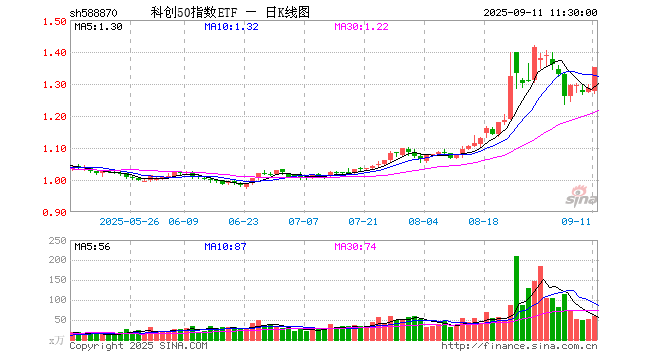 9月11日,截止午间收盘,科创50指数ETF(588870)涨5.14%,报1.351元,成交额7854.60万元。科创50指数ETF(588870)重仓股方面,中芯国际截止午盘涨7.08%,海光信息涨20.00%,寒武纪涨10.76%,澜起科技涨2.54%,中微公司涨3.78%,金山办公涨3.59%,联影医疗涨0.95%,传音控股跌1.46%,九号公司涨0.85%。
