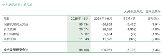 员工费用也同比下降7%至260.74亿元,比去年同期减少19.62亿元。以此计算,今年上半年邮储银行的人均费用约为13.46万元。