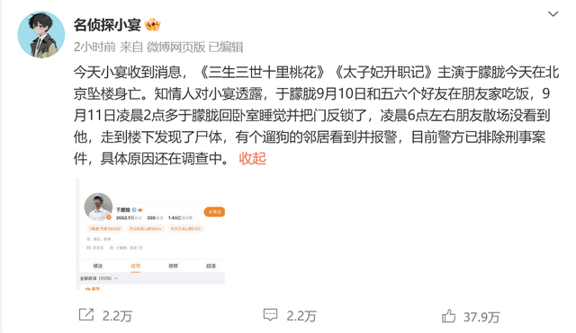 同日早些时间,娱乐博主@名侦探小宴 在社交媒体爆料称,演员于朦胧今天在北京坠楼身亡,引发广泛关注,但目前该条贴文已被删除。