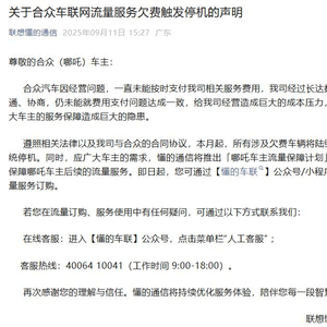 联想懂的通信表示,遵照相关法律以及公司与合众的合同协议,9月起,所有涉及欠费车辆将陆续触发系统停机。同时,应广大车主的需求,懂的通信将推出“哪吒车主流量保障计划”,全力保障哪吒车主后续的流量服务。即日起,合众(哪吒)车主可通过“懂的车联”公众号/小程序进行流量服务订购。