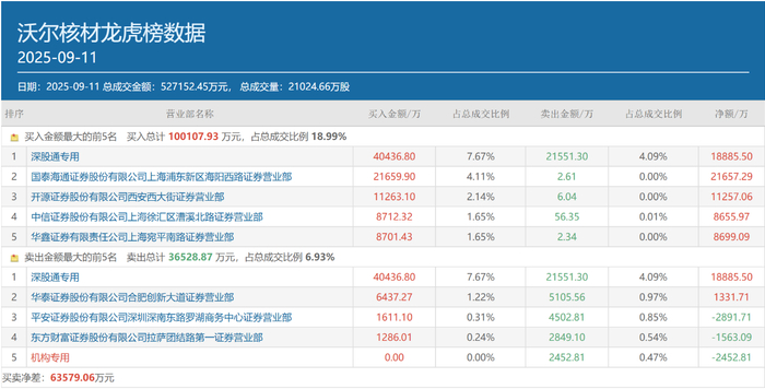 图:9月11日沃尔核材龙虎榜情况来源:同花顺财经