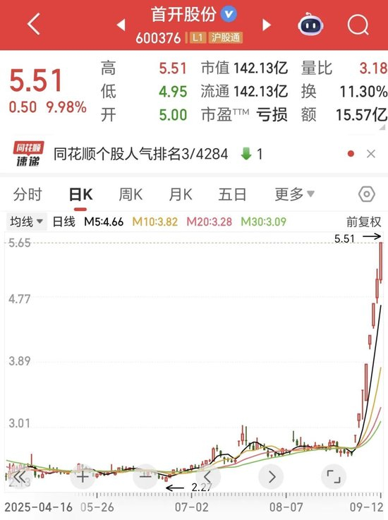 9月以来,地产股首开股份(600376.SH)股价坐上了火箭。9月3日至11日的7个交易日内,公司股价累计上涨约90%,总市值从68亿元飙升至129亿元,期间收获6个涨停板。